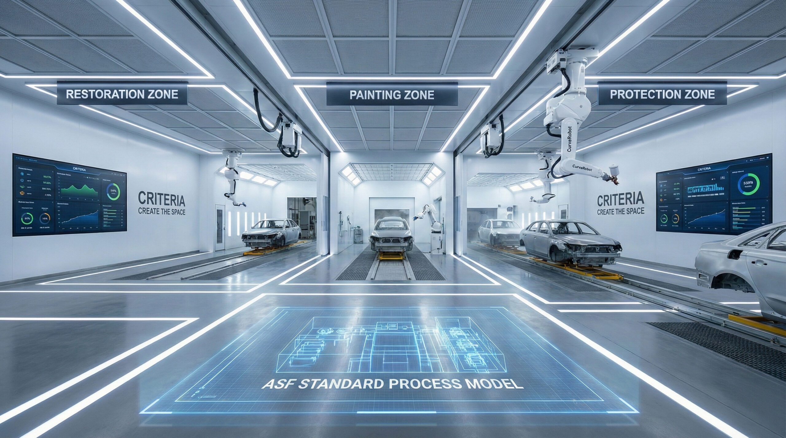 ASF 스마트 팩토리는 외장 복원, 도장, 보호 공정을 하나의 구조로 통합한 모델로, 공정 기준과 데이터 시스템이 공간 전체를 설계하는 형태다. 이 구조는 공간 규모와 관계없이 동일하게 작동하도록 설계되어 있다.